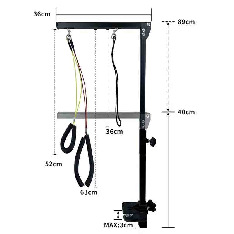 Der Pflegearm kann an jeder Tischplatte ohne Beschädigung angeschraubt werden. Hilft, den Hund beim Arbeiten zu sichern und überall gut erreichen zu können. Schlaufen sind weich gepolstert.