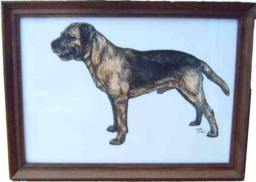 Einzelstück: handcolorierte Zeichnung vom Border Terrier, dunkelbrauner Vollholzrahmen mit Glaseinsatz. Original! Maße incl. Rahmen: 25 x 33 cm Ein wertvolles Geschenk für den Border-Freund!